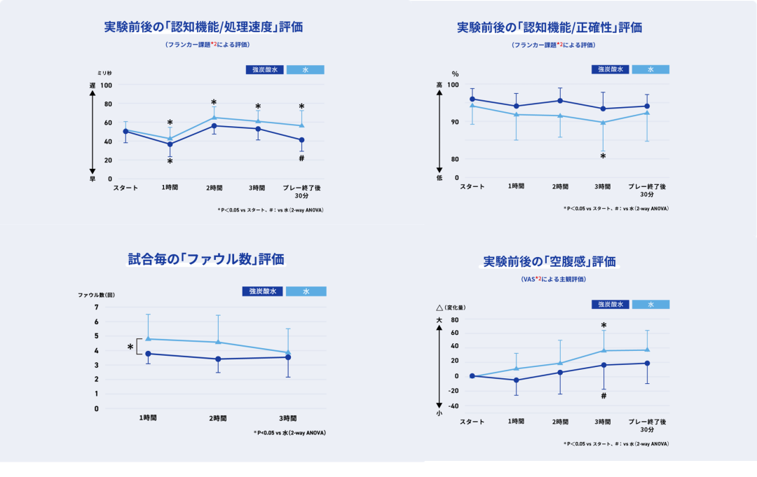 飲用氣泡水前后的認(rèn)知機(jī)能、犯規(guī)次數(shù)、饑餓感變化 圖片來源:朝日軟飲料