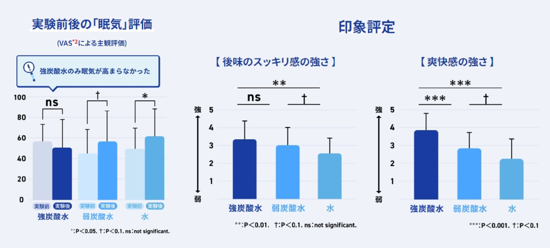 其中,最常見的就是提神功能。朝日就曾通過研究表明,強(qiáng)碳酸水可以防止因精神疲勞而引起的困倦。不僅如此,強(qiáng)碳酸水給人強(qiáng)烈的刺激感和清爽感,而這種清爽、爽快的感覺被認(rèn)為是防止困倦和疲勞的因素。