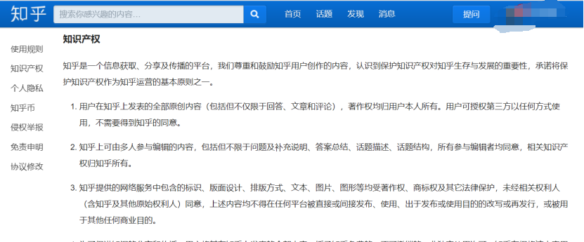 從前文知乎的用戶政策第三條可以看到,知乎提供的網(wǎng)絡(luò)服務中包含的標識、版面設(shè)計、排版方式、文本、圖片、圖形等均受著作權(quán)、商標權(quán)及其它法律保護,未經(jīng)相關(guān)權(quán)利人(含知乎及其他原始權(quán)利人)同意,上述內(nèi)容均不得在任何平臺被直接或間接發(fā)布、使用、出于發(fā)布或使用目的的改寫或再發(fā)行,或被用于其他任何商業(yè)目的。