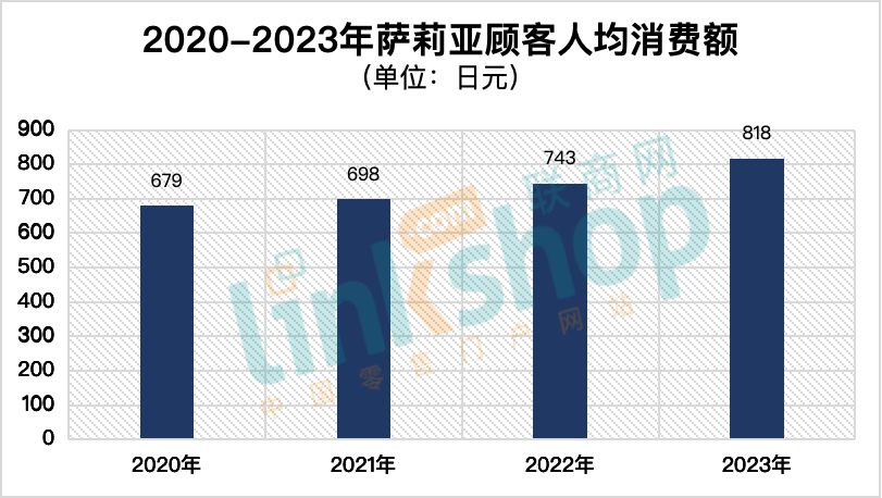 截至2023年8月期,薩莉亞的年度凈利潤更是高達(dá)2.5億人民幣。但我們需要重點(diǎn)關(guān)注的是“每位顧客的人均支出”。以下是薩莉亞近幾年財(cái)務(wù)業(yè)績(jī)公布的顧客人均支出趨勢(shì)。