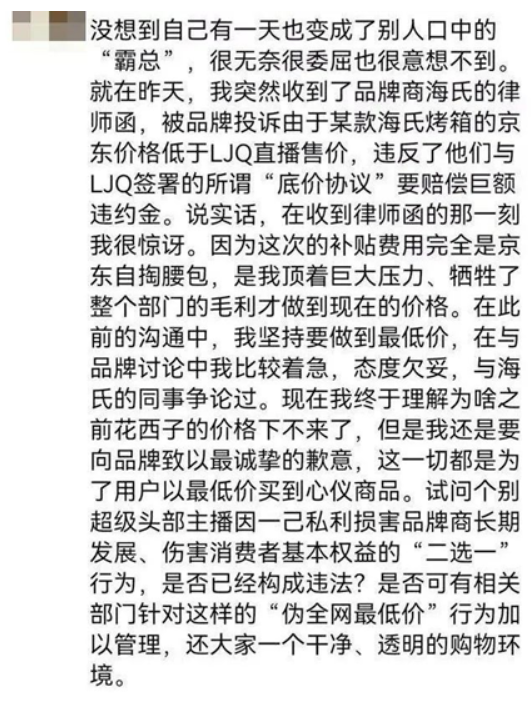什么意思呢?就是“李佳琦直播間”的“海氏烤箱”應該全網(wǎng)最便宜,才不會有問題。