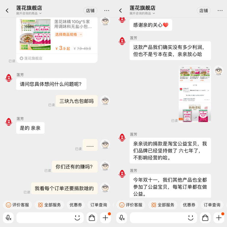 對(duì)此,蓮花味精淘寶客服回應(yīng):利潤確實(shí)不多,但也沒有虧本,每筆訂單還有部分利潤用于公益項(xiàng)目捐贈(zèng)。捐款是因?yàn)樵O(shè)置了淘寶公益寶貝,已經(jīng)堅(jiān)持六七年了。并且今年天貓雙11期間,所有產(chǎn)品都設(shè)置成了公益寶貝,每筆訂單都在做公益。