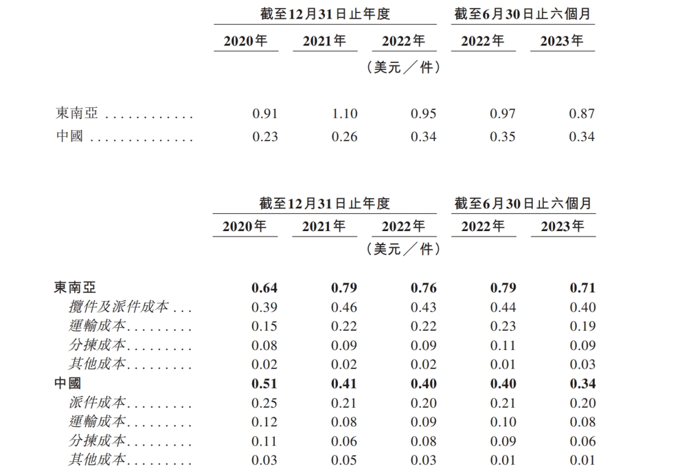 從單票價(jià)格與單票成本來(lái)看,極兔在東南亞市場(chǎng)和中國(guó)市場(chǎng)的近三年平均單票收入分別為0.99美元/件、0.28美元/件,而近三年平均單票成本分別為0.73美元/件、0.44美元/件,這就意味著,極兔在東南亞每做一單能獲利0.26美元,在中國(guó)則是每做一單虧損0.16美元。