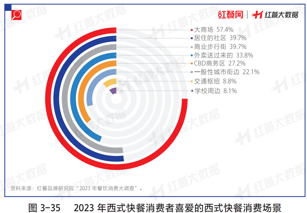 大商場(chǎng)店、社區(qū)店、商業(yè)步行街店、外賣都是西式快餐的主流消費(fèi)渠道!2023年餐飲消費(fèi)大調(diào)查”數(shù)據(jù)顯示,選擇在大商場(chǎng)店就餐的西式快餐消費(fèi)者占比最高,為57.4%;選擇社區(qū)店和商業(yè)步行街門店的西式快餐消費(fèi)者占比相當(dāng),均為39.7%;選擇點(diǎn)外賣的西式快餐消費(fèi)者則達(dá)到了33.8%。
