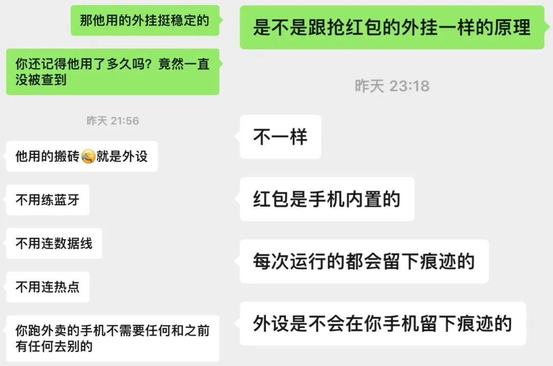 外掛分外置和內(nèi)置軟件兩種。前者不易被系統(tǒng)監(jiān)測(cè),會(huì)模擬人在手機(jī)屏幕上的操作思路、控制按鈕來(lái)?yè)寙巍?jù)一位商家透露,這種外掛多由人工組裝,需先付定金,后根據(jù)不同的手機(jī)型號(hào)來(lái)制作,制作周期較長(zhǎng),價(jià)格近千元。