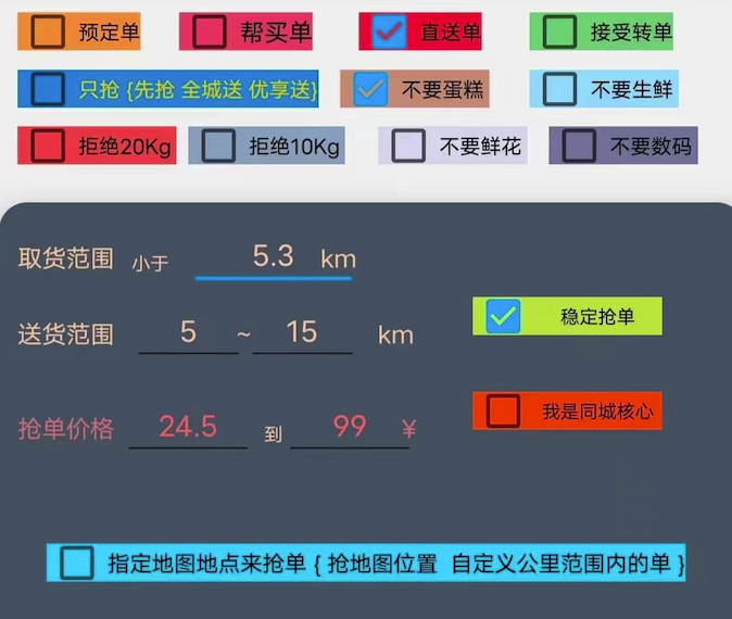 這些外掛的功能大致相同,多是篩選、搶單的作用,輕重量、顧客加價(jià)配送、取送范圍近、不易傾灑毀壞的訂單,都可以是外掛的目標(biāo)單。