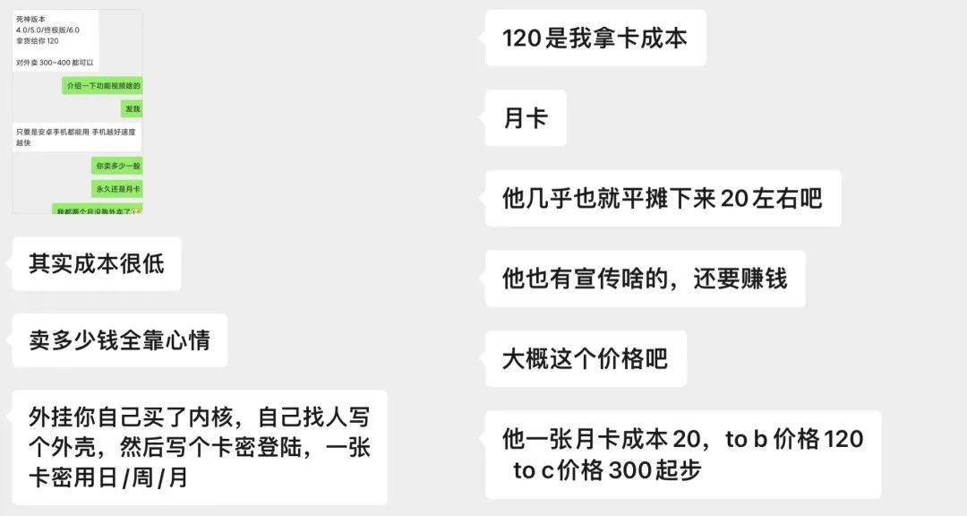 一位商家透露了這些外掛的制作方法:只要買到系統(tǒng)內(nèi)核,找?guī)讉(gè)大學(xué)生“包裝”一下,就能上市開賣。每單成本在幾十塊,但售價(jià)可以叫到300-800每月,“賣多少錢全靠心情”。