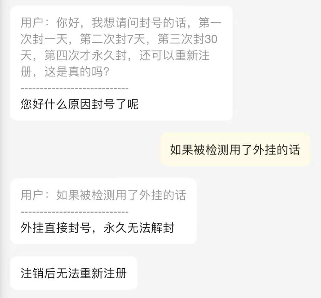 美團(tuán)客服對(duì)因外掛封號(hào)的回應(yīng)|圖源自作者截圖