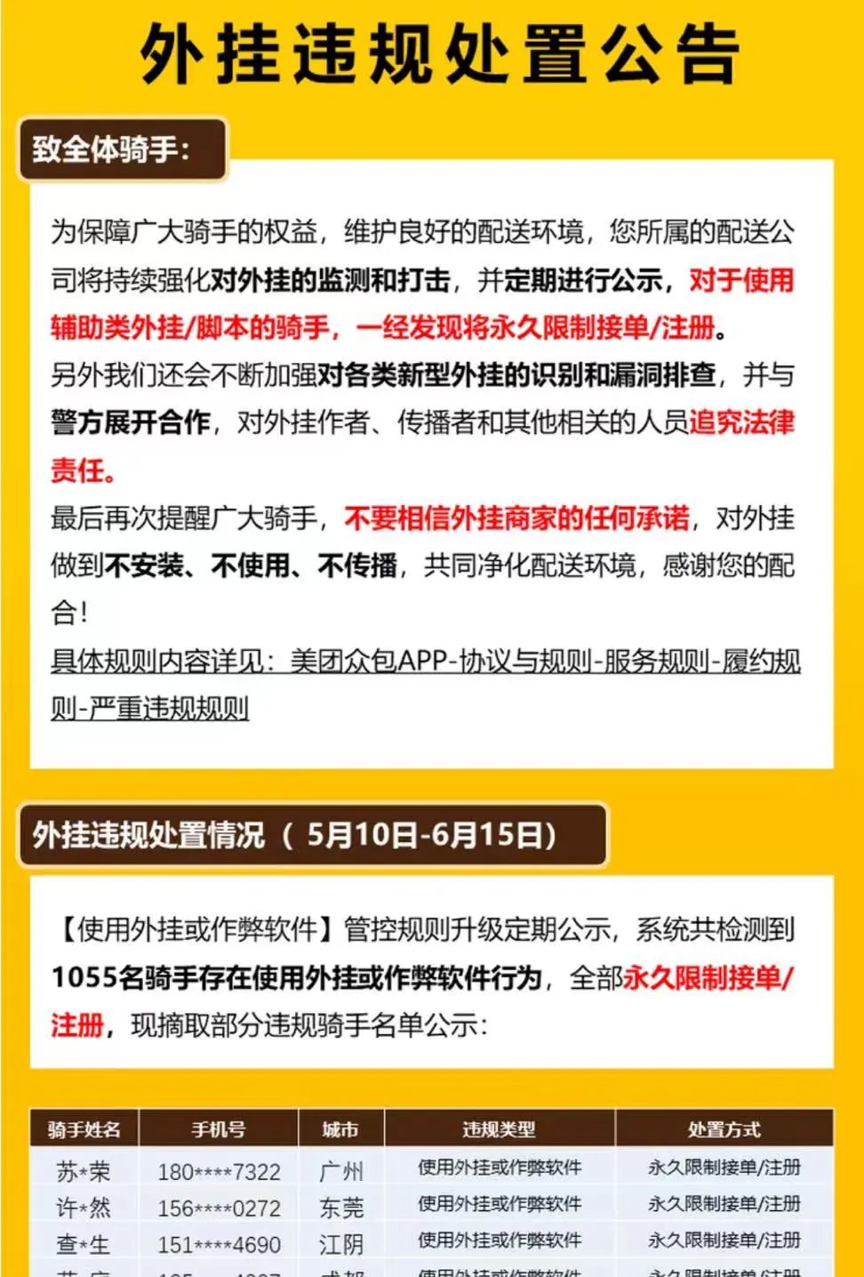 一位商家回憶,外掛存在已久,最初緊隨眾包平臺(tái)前后出現(xiàn)。近兩年,它們接連升級(jí),穩(wěn)定性和隱蔽性也在逐漸上升。但魔高一尺道高一丈,平臺(tái)和外掛的對(duì)抗也在升級(jí):2023年3至6月,美團(tuán)連發(fā)四次外掛警示公告,對(duì)2909名騎手做出永久限制接單/注冊(cè)的處罰,意味著這批騎手在美團(tuán)的職業(yè)生涯將徹底結(jié)束。