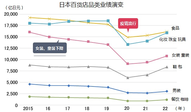 作為百貨店業(yè)績支柱的服裝品類,在1991年的時候,服裝品類業(yè)績占比為40.4%,伴隨金融風(fēng)險和消費(fèi)預(yù)期衰減,業(yè)績占比不斷下降,在2019年下降到29.3%,到2021年下降到26.4%,居然低于食品類的29%,百貨店的基本特性之一出現(xiàn)動搖和扭轉(zhuǎn)。其基本背景是,大約到2013年之前,國民大眾的就業(yè)雇傭環(huán)境惡化、基本薪酬收入減少、優(yōu)衣庫等低價快時尚服裝出現(xiàn),部分低價服裝連鎖店客流涌動、大行其道。2014年之后一段時間,日元再次出現(xiàn)貶值,本國服裝購買客單價轉(zhuǎn)為上升,以中國游客為代表的入境游客服裝購買力大幅顯現(xiàn),服裝銷售業(yè)績出現(xiàn)一段時間回潮,但同時網(wǎng)絡(luò)購買熱潮興起,雖然有相對優(yōu)越的面對面附加服務(wù),但是百貨店服裝營銷性價比低劣的特點(diǎn)被充分揭示出來,總體業(yè)績一路下滑。