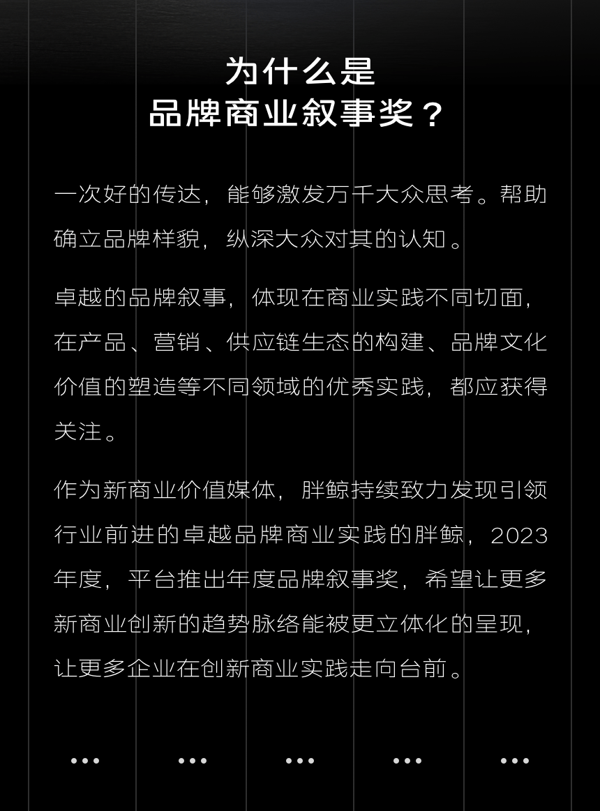 優(yōu)秀的品牌敘事,體現(xiàn)在商業(yè)實踐不同切面,一次好的傳達,能夠激發(fā)萬千大眾思考,幫助確立品牌樣貌,縱深大眾對其的認知。作為新商業(yè)價值媒體平臺,胖鯨持續(xù)致力發(fā)現(xiàn)引領(lǐng)行業(yè)前進的卓越品牌商業(yè)實踐,期待您的參與。