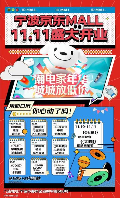 此外,11月11日當天,二次元中庭宅舞大賽、創(chuàng)意樓體高空表演、米其林大廚美食品鑒會、JDG二隊水友賽等豐富多彩的活動都將落地寧波京東MALL,為消費者帶來更多驚喜和樂趣。