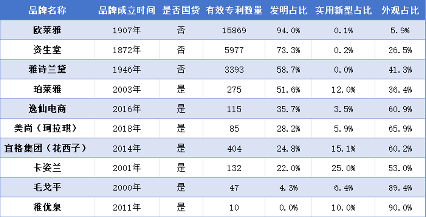 與此同時,在研發(fā)能力上,不妨將優(yōu)時顏與其他國際大牌及國貨品牌做對比,便能知曉答案——知產(chǎn)力對比了7個國貨品牌(珀萊雅、逸仙電商、美尚、花西子、卡姿蘭、毛戈平、稚優(yōu)泉)和3個國外品牌(歐萊雅、資生堂、雅詩蘭黛)的有效專利的分類,中國頭部國貨美妝與國際大牌的專利數(shù)目上還有一定差距,且專利多為“外觀專利”,缺乏實際的產(chǎn)品功效專利。
