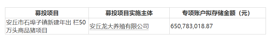 資金到賬之后,可轉(zhuǎn)換公司債券部分募集資金項目實施主體、公司全資孫公司安丘龍大養(yǎng)殖有限公司擬在達州銀行開設(shè)專戶賬戶,將部分募集資金存入這一專項賬戶,存儲金額不超過6.51億元(不包含未來可能產(chǎn)生的利息等)。