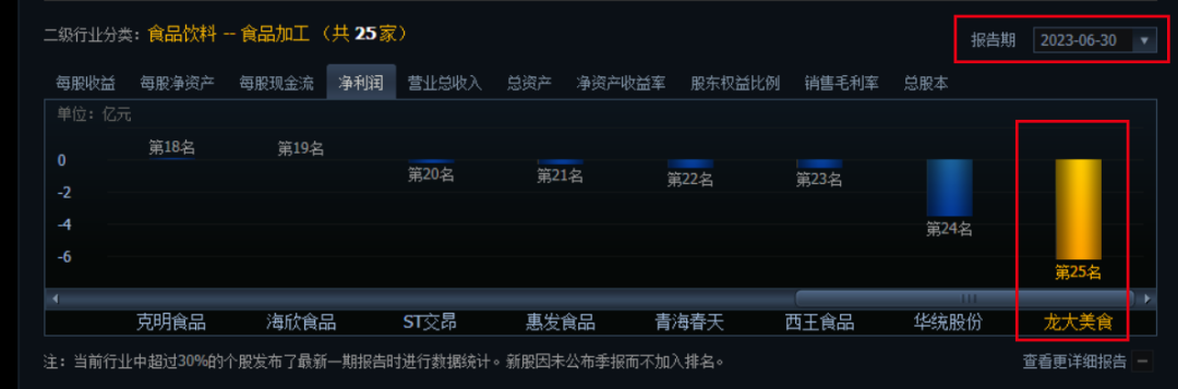 在同花順統(tǒng)計的25家食品加工企業(yè)中,就各企業(yè)披露的2023年中期財報來計算,龍大美食的歸母凈利潤墊底。