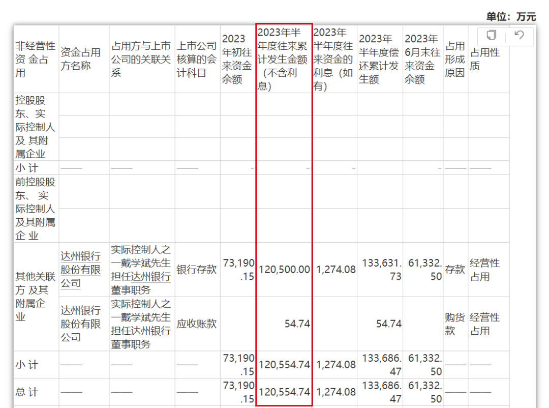 在公布2023年中期財報時,龍大美食同步披露了一份《半年度非經(jīng)營性資金占用及其他關(guān)聯(lián)資金往來情況匯總表》。其中,2023年上半年,公司與達州銀行往來累計發(fā)生金額12.06億元。