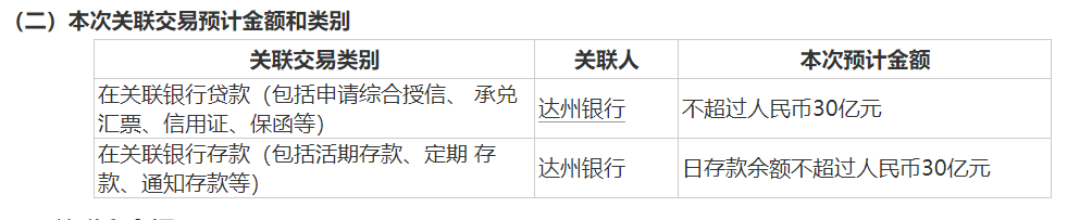 2023年,公司預計在達州銀行辦理貸款業(yè)務(wù)不超過30億元;在達州銀行辦理存款業(yè)務(wù)日存款余額不超過30億元。