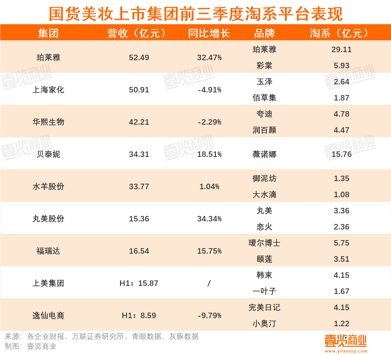 萬(wàn)聯(lián)證券研究所顯示,珀萊雅旗下珀萊雅和彩棠兩個(gè)品牌前三季度在淘系平臺(tái)總GMV分別是29.11億及5.93億,而此前在老牌國(guó)貨彩妝賽道一直有著不錯(cuò)的成績(jī)的完美日記,前三個(gè)季度淘系也僅有4.15億的GMV。