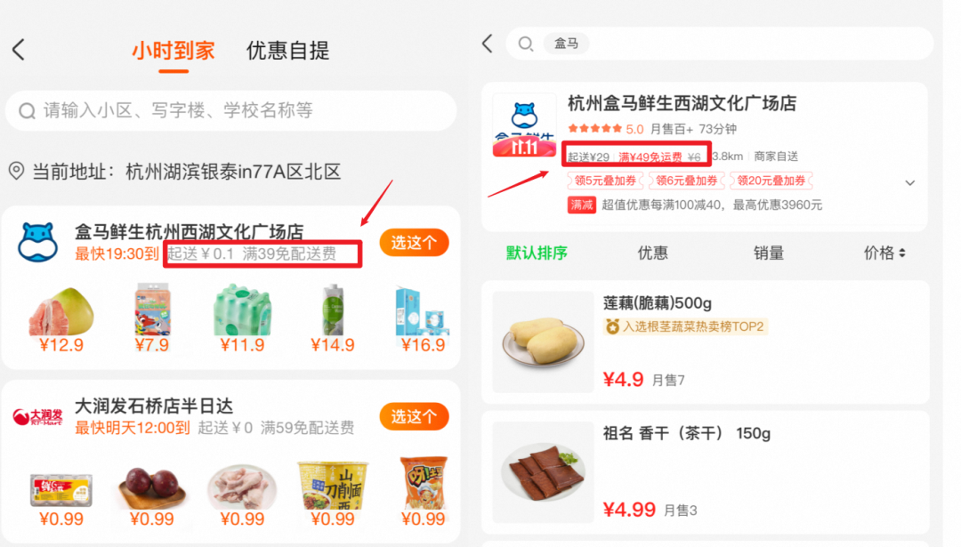 此外,在配送服務(wù)上,盒馬在淘鮮達(dá)的免運(yùn)費(fèi)門檻,要低于“京東到家”。依然以盒馬(西湖文化廣場店)為例,該店鋪在“京東到家”的起送價(jià)是29元、滿49元免運(yùn)費(fèi),而在淘鮮達(dá)的起送價(jià)則是0.1元、滿39元就能免運(yùn)費(fèi)。不過區(qū)別在于,雖然盒馬在“京東到家”的店鋪都標(biāo)注了“商家自送”,但部分店面的配送時(shí)間上,“京東到家”要比淘鮮達(dá)快15分鐘左右。