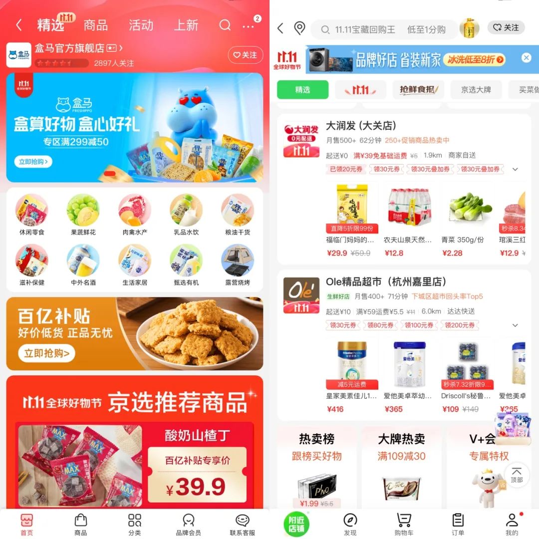 左:京東的盒馬官方旗艦店 右:內(nèi)置“京東到家”的大潤發(fā)