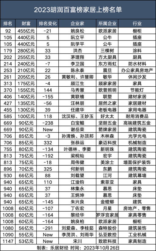今年的胡潤百富榜上,泛家居行業(yè)有33位入榜,有人落榜,有人新晉入榜。