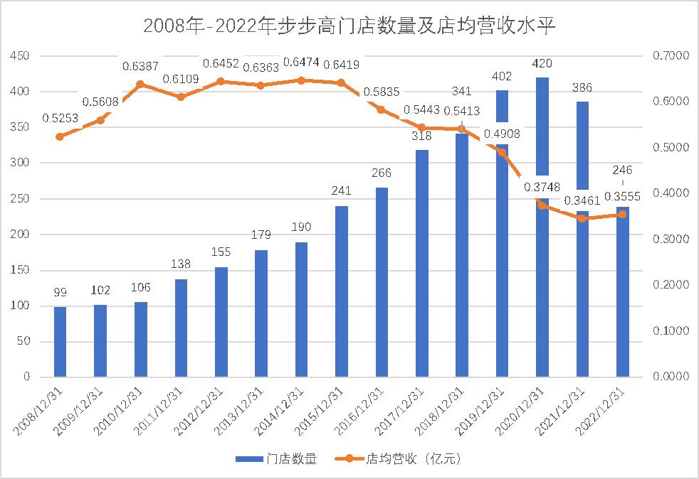 2008年-2022年步步高門店數(shù)量及店均營收水平 制圖:乾行