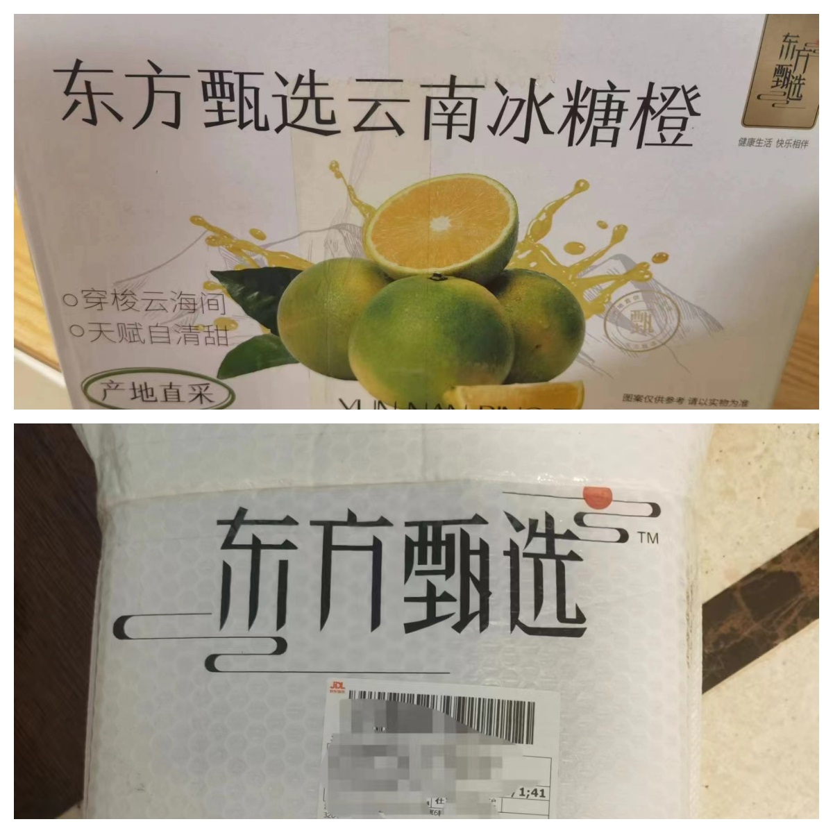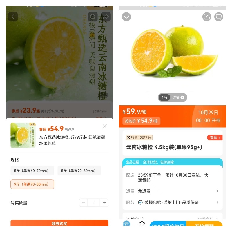 東方甄選和盒馬的冰糖橙都是9斤,54.9元,很顯然這兩家的標(biāo)價(jià)是有對(duì)標(biāo)性的。我在兩個(gè)平臺(tái)都買(mǎi)了,初收到貨時(shí),東方甄選的品相更好,單果更大,更黃一些,盒馬的單果小一些,比較青,看著像沒(méi)熟。實(shí)際吃起來(lái)恰恰相反,東方甄選的果子有些酸,盒馬的更甜更好吃。我想,不一定盒馬的果子每一次都比東方甄選的好吃,這恰恰是農(nóng)產(chǎn)品做品牌最難的地方,品控始終無(wú)法保持一致,有較大偶然和隨機(jī)現(xiàn)象。