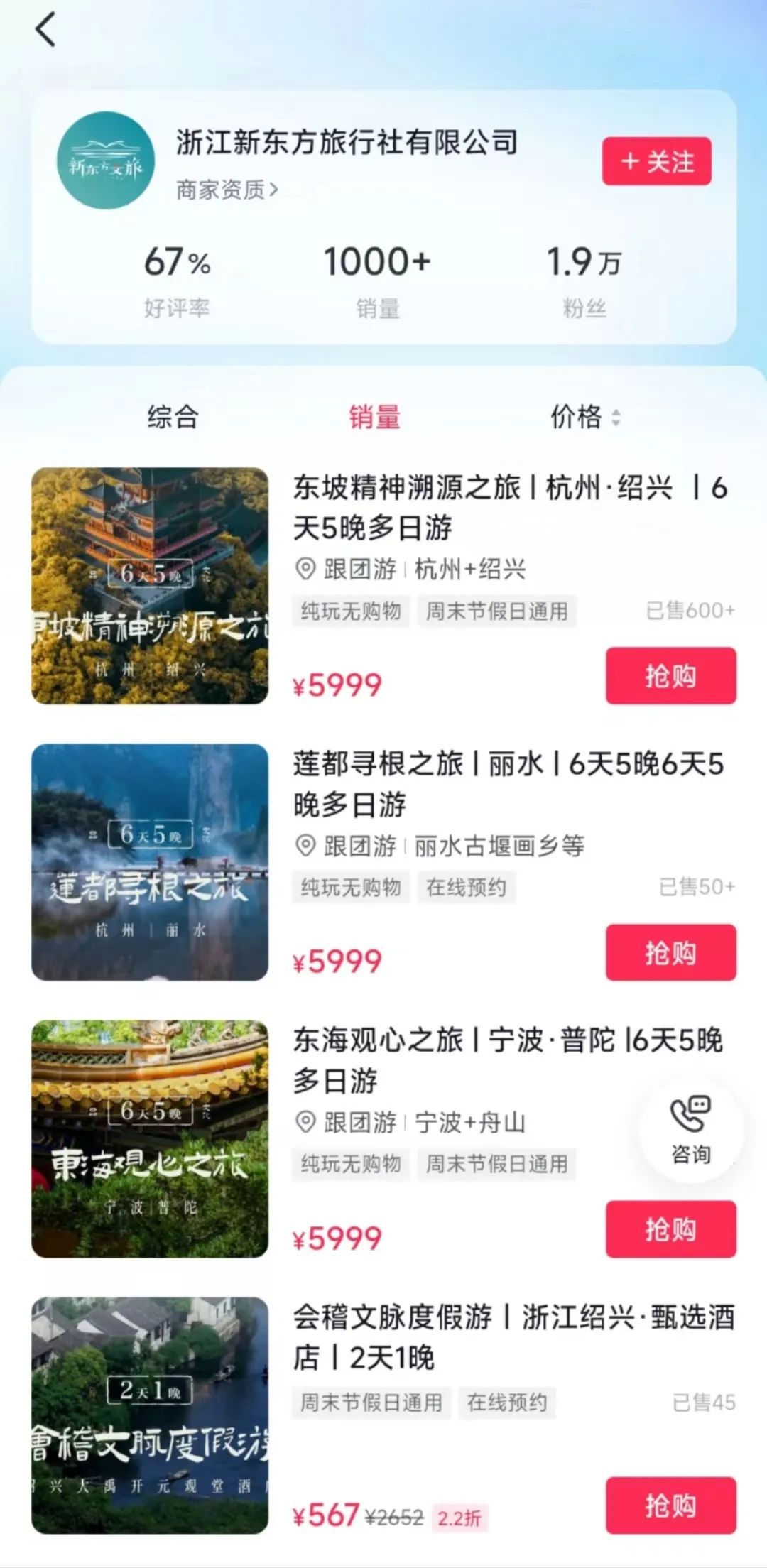 浙江新東方文旅抖音賬號頁面顯示,目前已上線23件旅游線路團(tuán)購產(chǎn)品,“東坡溯源之旅”銷量最好,售價5999元,已售600+;其他線路顯示銷售量均在百件以下。此外,新東方文旅的線路產(chǎn)品已延伸至陜西、四川、河南等省份,不過從抖音銷售數(shù)據(jù)反饋平平。