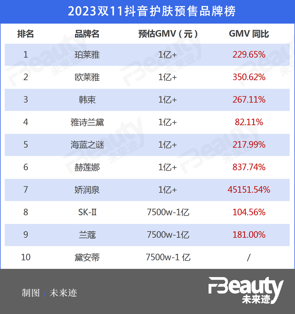 抖音則整體處于上升狀態(tài),飛瓜數(shù)據(jù)顯示:預(yù)售期間抖音美妝的整體GMV同比增長(zhǎng)68.79%。彩妝和護(hù)膚TOP10品牌幾乎全部處于增長(zhǎng)狀態(tài),且大多數(shù)品牌的同比增長(zhǎng)率在100%以上。