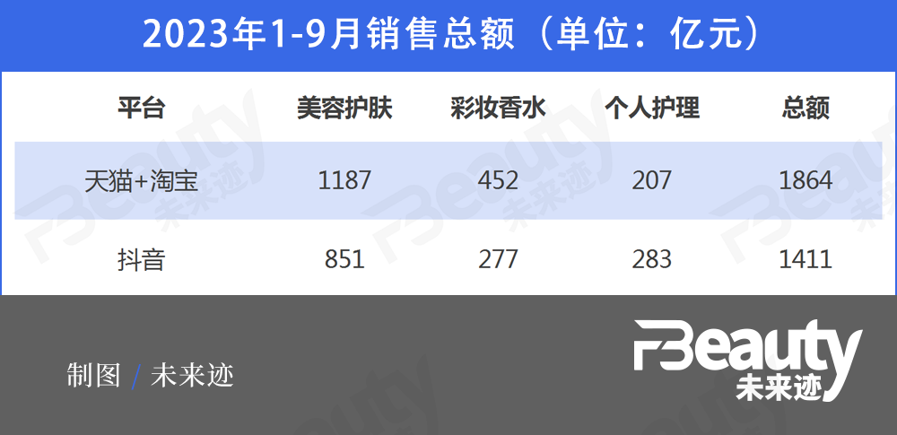 第三方數(shù)據(jù)監(jiān)測(cè)機(jī)構(gòu)的數(shù)據(jù)顯示,2023年1-9月,抖音美妝“美容護(hù)膚”“個(gè)人護(hù)理”“彩妝香水”三個(gè)主要品類(lèi)的銷(xiāo)售額已經(jīng)達(dá)到1411億元,和天貓美妝的差距正在不斷縮小。