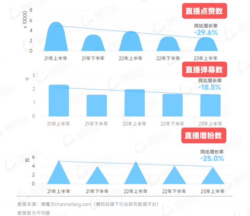 嬋媽媽的數(shù)據(jù)顯示,今年上半年,和直播轉(zhuǎn)化率相關(guān)的三個(gè)重要指標(biāo)——直播點(diǎn)贊數(shù)同比下滑了29.6%,彈幕數(shù)下降18.5%,增粉數(shù)下降25%。