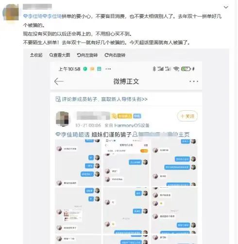 更別提還有黃牛和騙子借機充斥其中,貨品真假難辨不說,一不留神就要面臨財物兩失的后果。多數(shù)被騙套路是騙子在雙十一拼單話題中多次聲稱自己要轉賣物品,但私聊后往往采用微信,而不是通過平臺交易,為騙取對方信任,騙子還會發(fā)送作假的訂單錄屏,當收到轉賬后,騙子會迅速拉黑對方,杳無音訊。