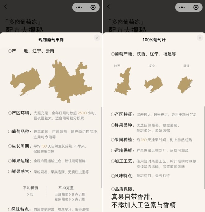 比如喜茶率先在行業(yè)內(nèi)公開產(chǎn)品配方原料、營養(yǎng)成分和原料溯源信息,為現(xiàn)制茶飲配置配料表和營養(yǎng)成分表。目前喜茶已通過“喜茶GO”微信小程序公開了40多款產(chǎn)品的配方原料,涉及超40種真茶、真果、真奶、真糖等原料溯源信息。在此基礎(chǔ)上,首批已完成第三方檢測的產(chǎn)品,還同步上線了產(chǎn)品營養(yǎng)成分報(bào)告。