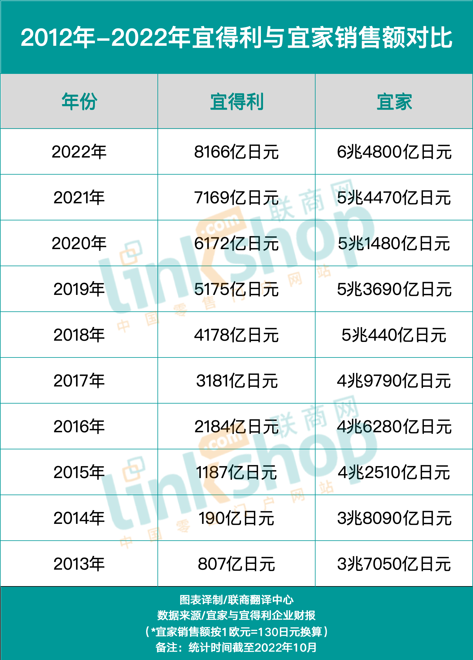 2012年—2022年宜得利與宜家銷售額對比。來源:Note 制圖:聯(lián)商翻譯中心