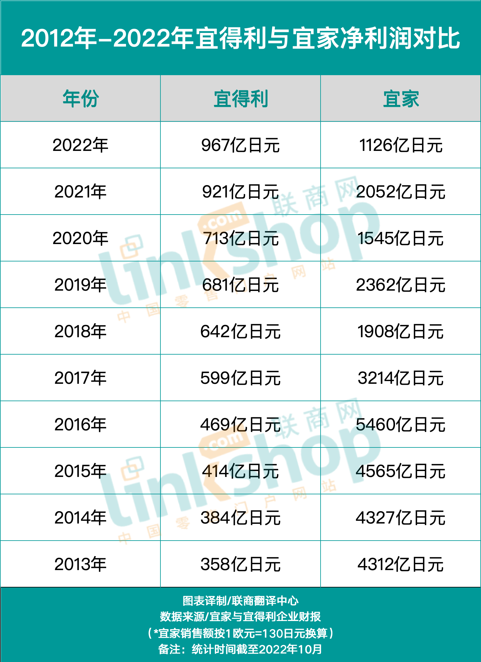 2012年—2022年宜得利與宜家凈利潤對比。來源:Note 制圖:聯(lián)商翻譯中心