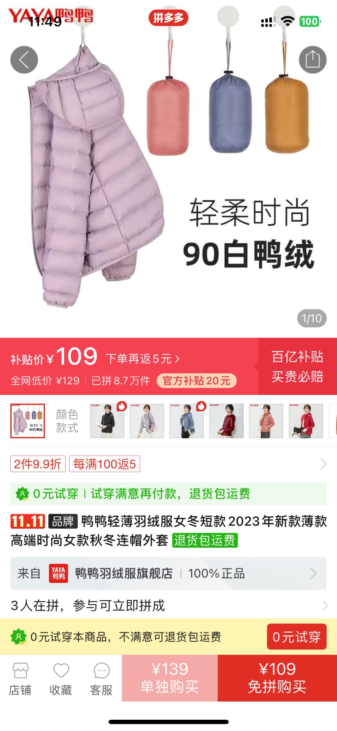 《聯(lián)商網(wǎng)》在拼多多百億補(bǔ)貼頻道發(fā)現(xiàn),鴨鴨一款含白鴨絨量90%,售價(jià)109元的輕薄款羽絨服,已經(jīng)拼出8.7萬(wàn)件。