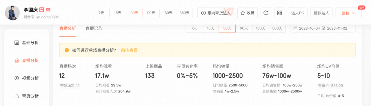 圖說(shuō):李國(guó)慶在抖音開(kāi)播場(chǎng)均銷售額在1000萬(wàn)到2500萬(wàn)之間。