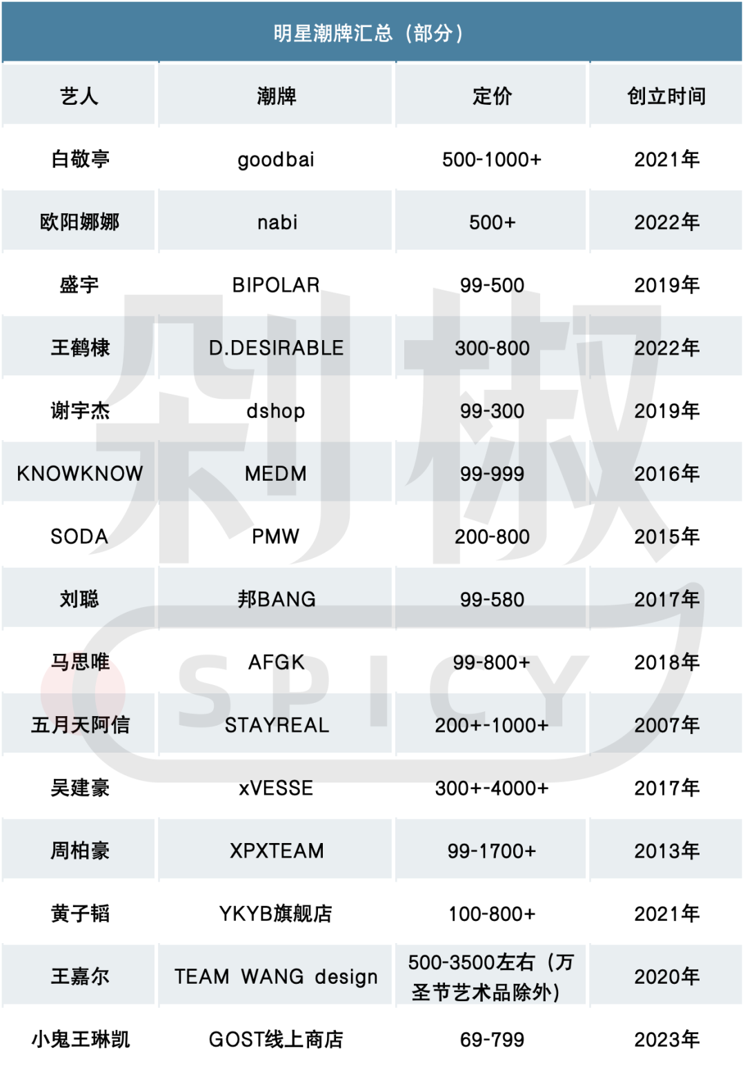 PUK入局時,明星潮牌賽道已經(jīng)處于“供大于求”的內卷狀態(tài)。不論是薛之謙、白敬亭等主流藝人,還是黃子韜、王鶴棣等偶像明星,很多藝人都推出了個人品牌。尤其是近幾年逐漸走進大眾視野中的說唱歌手,做潮牌的比例更高,馬思唯、KNOWKNOW等rapper都在經(jīng)營各自的服裝品牌,而且很多明星的個人品牌價格在99~499之間。