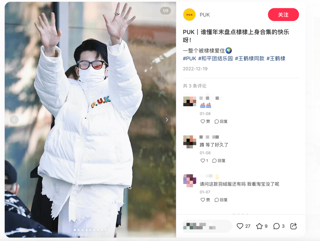 與大多數(shù)明星潮牌一樣,PUK的出圈離不開明星效應帶來的正反饋——強曝光。