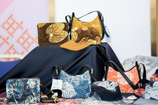 來自宋卡府的 Meedinatab Group蠟染扎染織物,使用多層蠟燭疊在一起打印或將蠟揉成類似石頭圖案,并萃取當?shù)刂参锏奶烊蝗玖线M行制作,希望讓更多人領略家鄉(xiāng)的自然之美