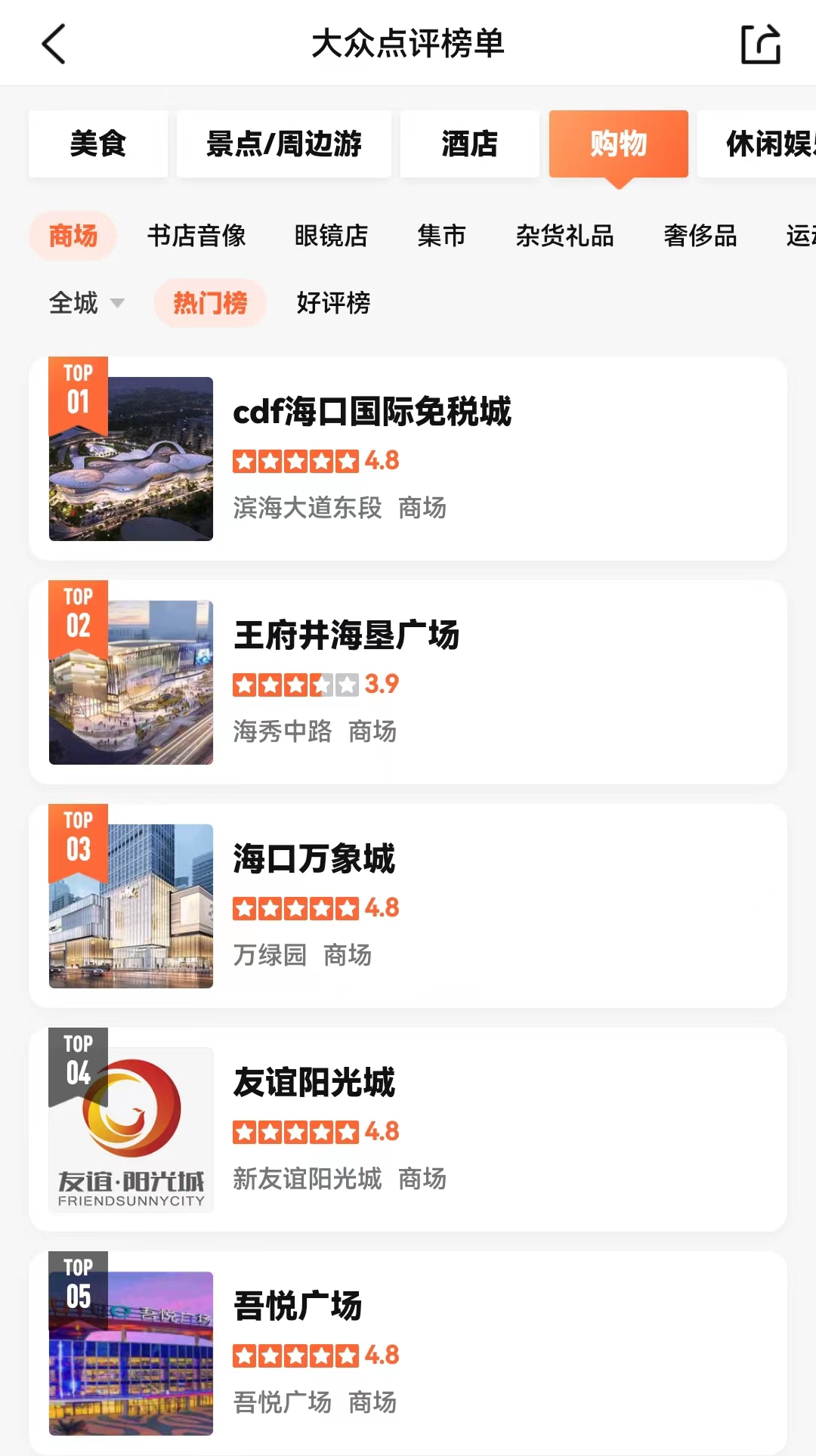 大眾點評三亞商場熱度榜TOP10,半數(shù)項目為近2年內開業(yè)的新項目——cdf?趪H免稅城、海口萬象城、王府井海墾廣場、華彩?跒硰V場、友誼南海城,后續(xù)龍湖海口天街、海口高興里、三亞大悅城、三亞歡樂東岸、三亞夏日站等大集團項目將接踵而至,新項目的吸引力與潛力可見一斑。且看明年?诤腿齺喌腡OP10榜單。