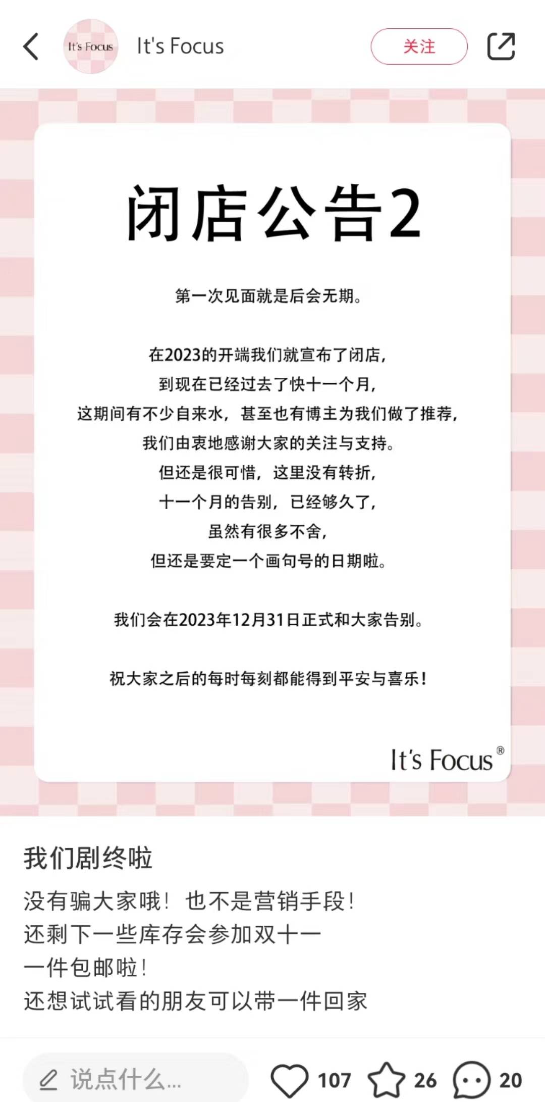 近日,國貨彩妝品牌lt's Focus薏珂思通過品牌小紅書賬號發(fā)布閉店公告,宣布將在2023年12月31日正式與消費(fèi)者告別。
