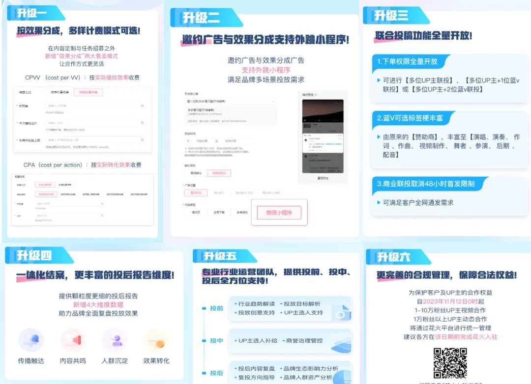 雙11前夕,B站官方商單平臺“花火平臺”迎來了6項(xiàng)能力升級,比如在內(nèi)容定制和任務(wù)招募外,新增了“效果分成”兩大售賣模式,可以按照播放量或是轉(zhuǎn)化量來結(jié)算,讓合作方式更靈活;邀約廣告和效果分成廣告,如評論區(qū)的藍(lán)鏈(點(diǎn)擊可外跳電商平臺或其他商品頁面),也將支持外跳微信小程序。