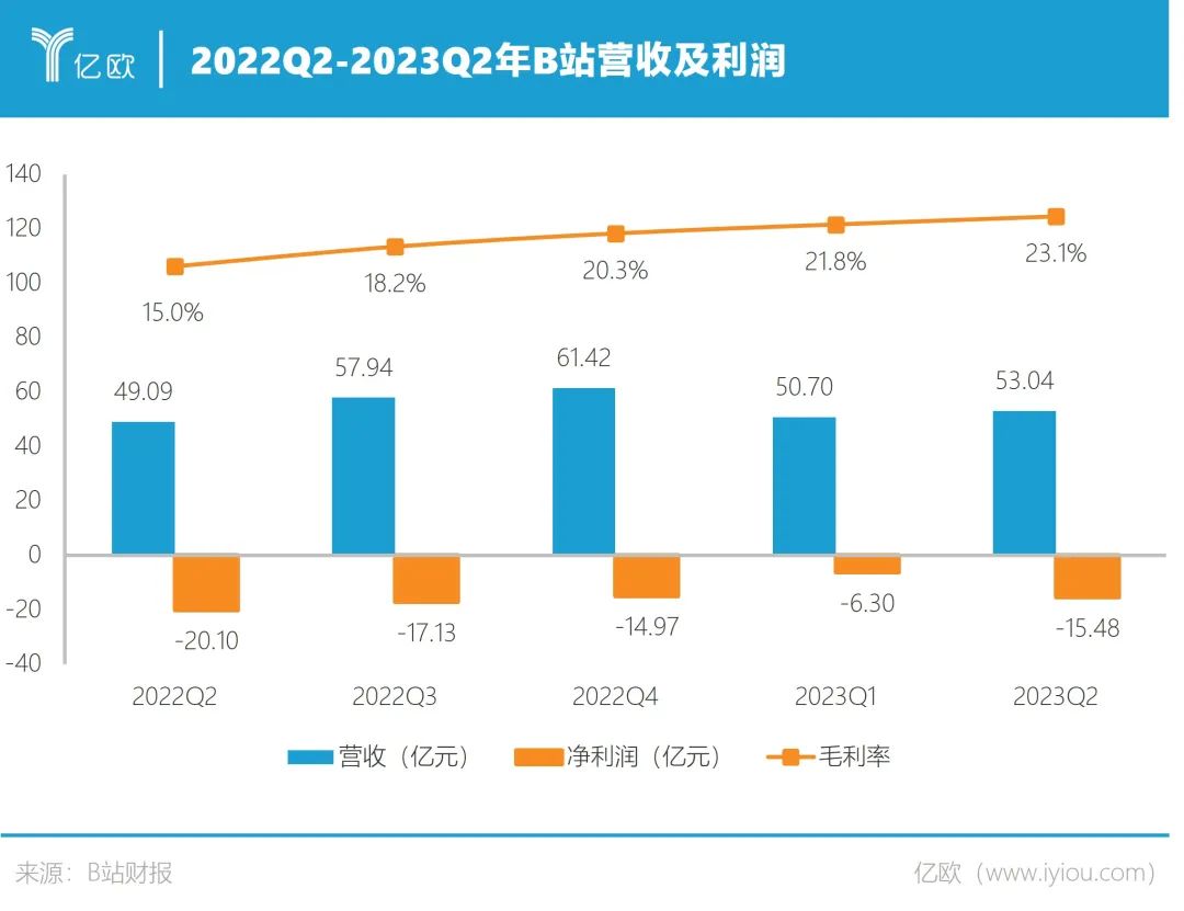 從結(jié)果來看,過去一年B站在商業(yè)化上表現(xiàn)不錯(cuò)。根據(jù)最新財(cái)報(bào)數(shù)據(jù),2023年第二季度,B站實(shí)現(xiàn)營收53.04億元,同比增長8%;錄得凈虧損15.48億元,同比收窄23%;毛利率連續(xù)四個(gè)季度取得增長,從15.0%提升到了23.1%。