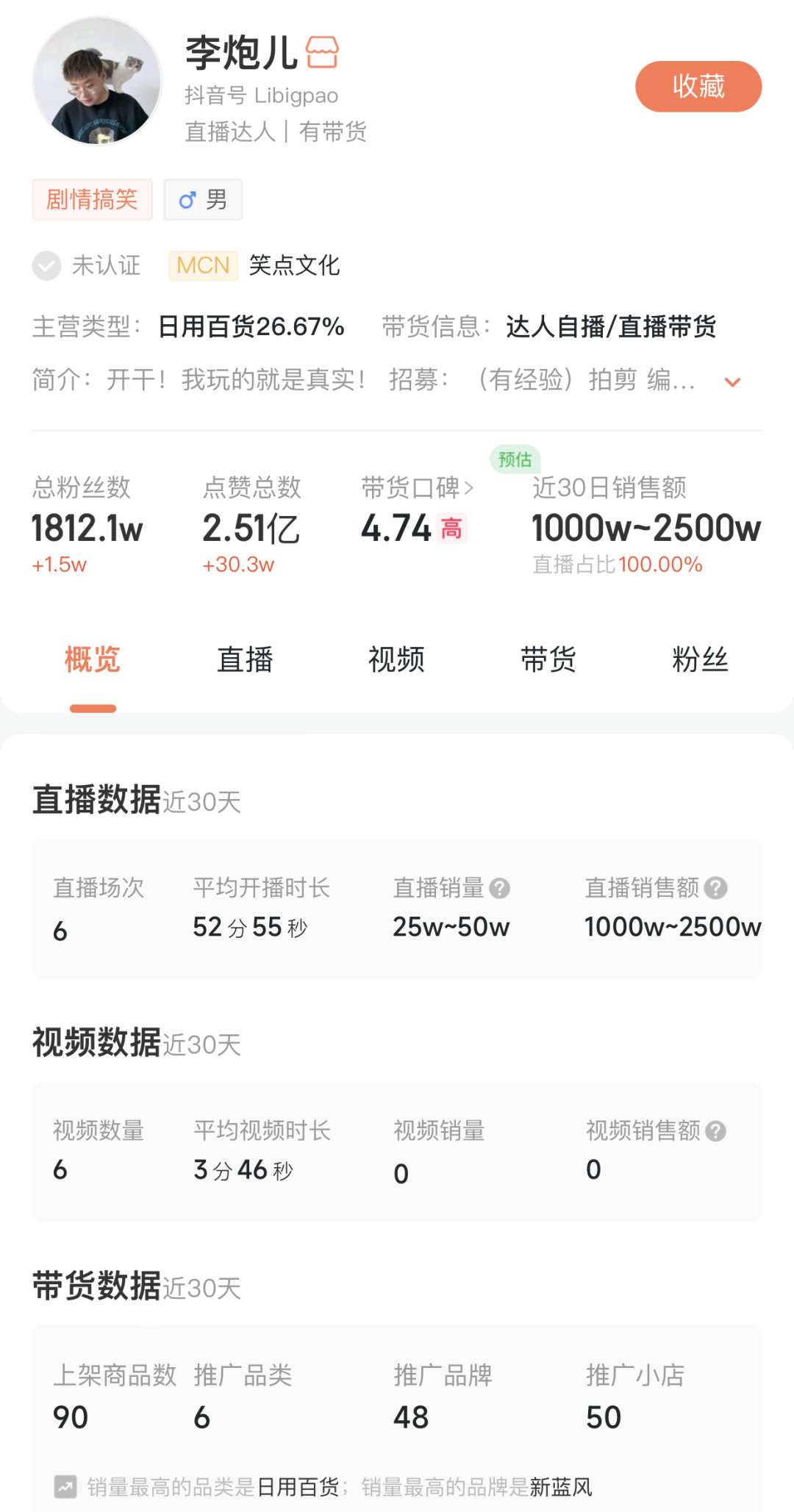 像網(wǎng)紅李炮兒,一句“玩的就是真實”,憑借各種離譜又爆笑的挑戰(zhàn),半年漲粉超千萬。蟬媽媽數(shù)據(jù)顯示,在其兩天的首次帶貨直播中,GMV在1000w-2500w之間,僅上線一個品就沖到了帶貨榜單第一名。