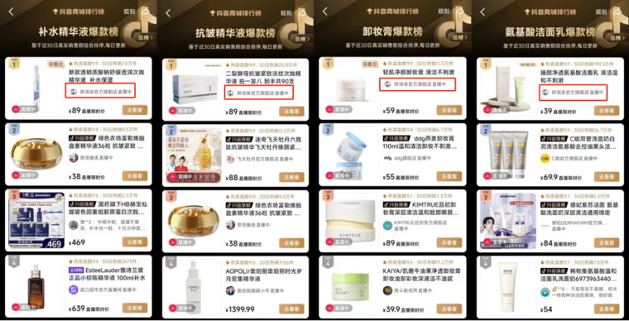 嬌潤泉就是三只羊靠著直播切片做起來的代表,作為一個僅有四款產(chǎn)品的白牌商家,在短短的一百多天里,所有產(chǎn)品均成功登上各細分類目的抖音排行榜第一,月銷高達1.5億。