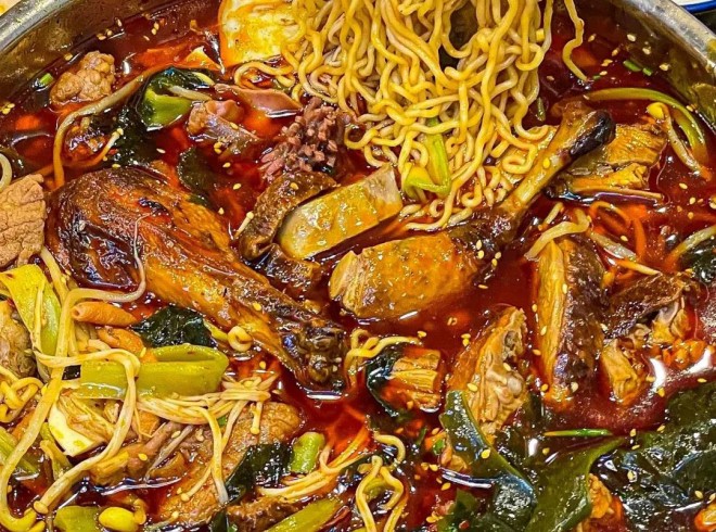 到了當(dāng)下,冒烤鴨變得更加標(biāo)準(zhǔn)化、零售化、便捷化,它走的是“紅湯+冒菜”的方式,品牌總部給門店發(fā)真空烤鴨、底料,門店切塊丟入湯底煮熟再端給顧客即可,這類模式把冒烤鴨做成了一鍋大雜燴的冒菜品類,比如顧客可以在鍋底加方便面、毛肚、土豆等火鍋類的食材。