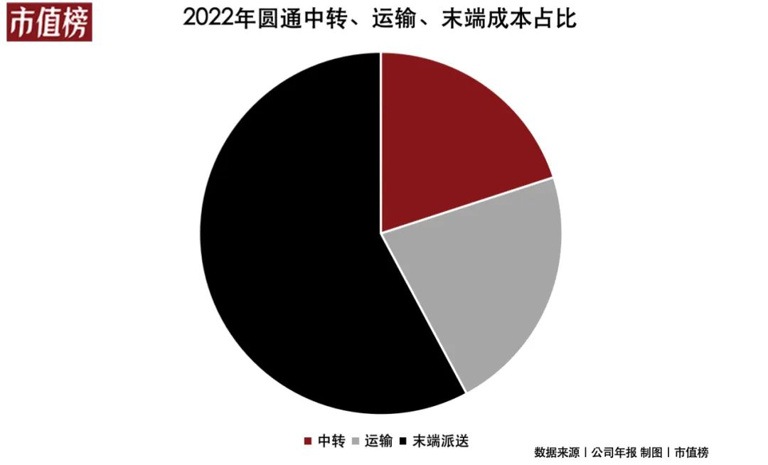 成本管控主要取決于三個環(huán)節(jié),中轉(zhuǎn)、運(yùn)輸和末端派送,以圓通為例,2022年三個環(huán)節(jié)的單票成本分別為0.46元、0.51元、1.33元。其中,末端派費(fèi)成本占比超過一半,達(dá)到57%,對比上一年增幅也最大,達(dá)14.7%,而分揀和運(yùn)輸成本則整體變化不大。