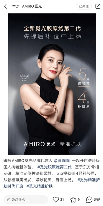 仔細觀察覓光的崛起過程,不難發(fā)現(xiàn),其與早期國產(chǎn)美妝品牌的路徑非常相似,都是通過明星+網(wǎng)紅直播進行推廣,進入市場。覓光不僅邀請了高圓圓作為品牌代言人,還邀請了王子文、蔡卓妍、鐘欣潼、張雨綺等明星在社交平臺上進行產(chǎn)品推廣和種草。這種“砸錢”的營銷方式,不僅依賴于前期美妝鏡業(yè)務的資本積累,還得益于了大量資本的加持。