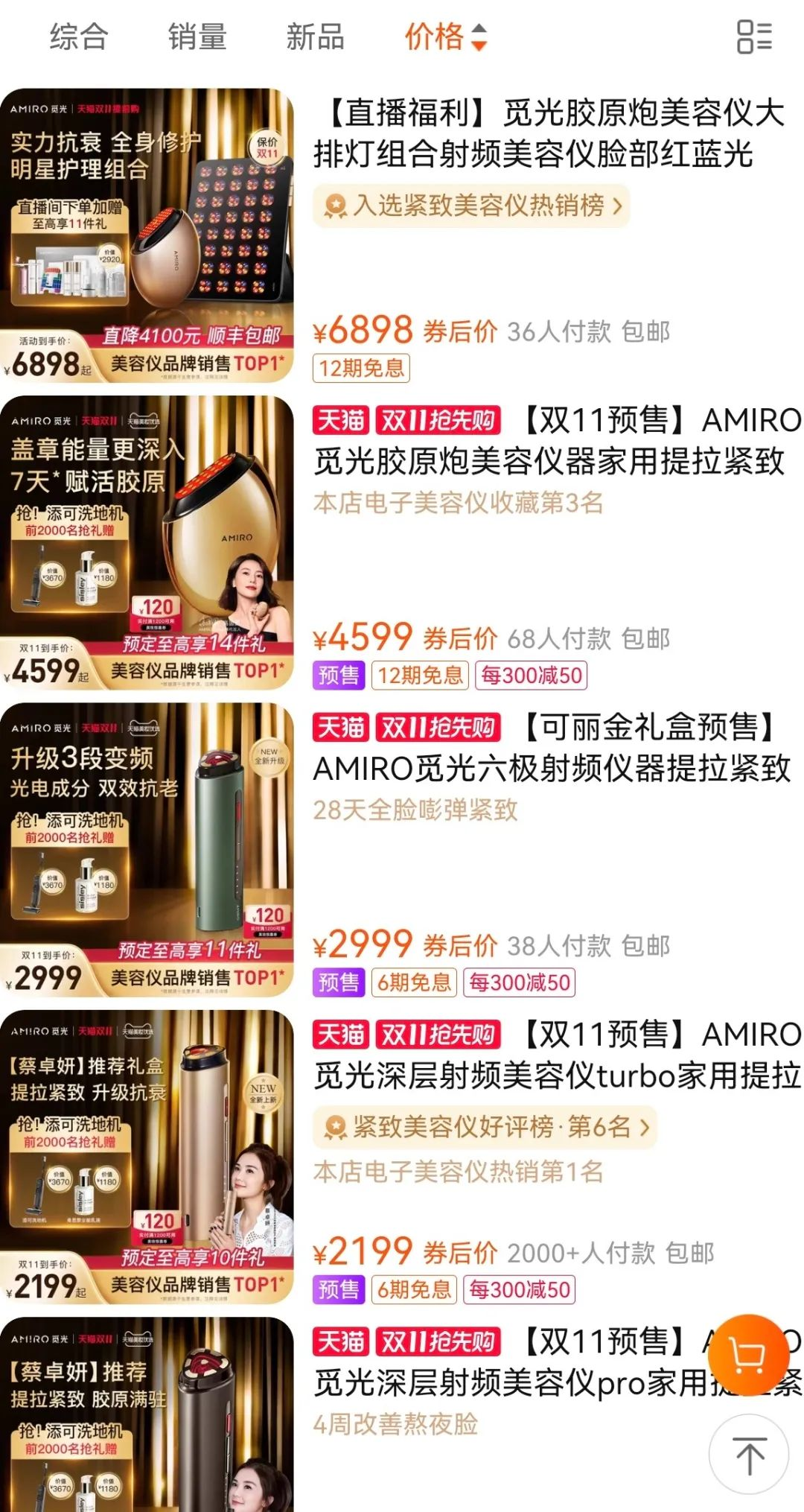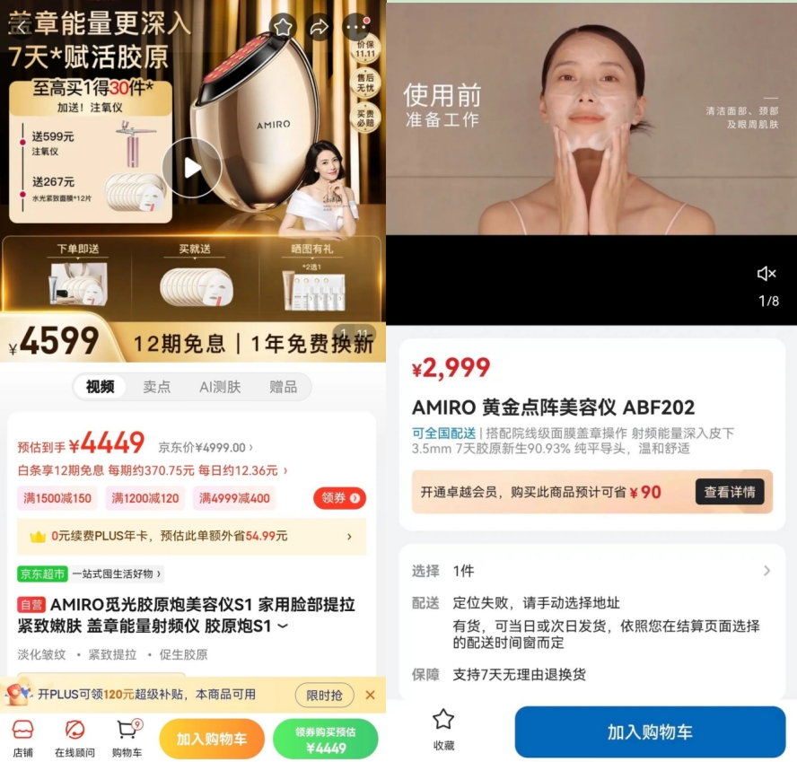 據(jù)公開信息顯示,AMIRO覓光膠原炮第一代產(chǎn)品在京東、天貓、抖音等不同平臺官方店鋪預估到手價為4599元,與賈乃亮、向太等達人抖音直播間預估到手價相差無幾,但在線下的山姆超市里,該款產(chǎn)品的日常售價為2999元,線上線下價格預估相差約1600元左右。